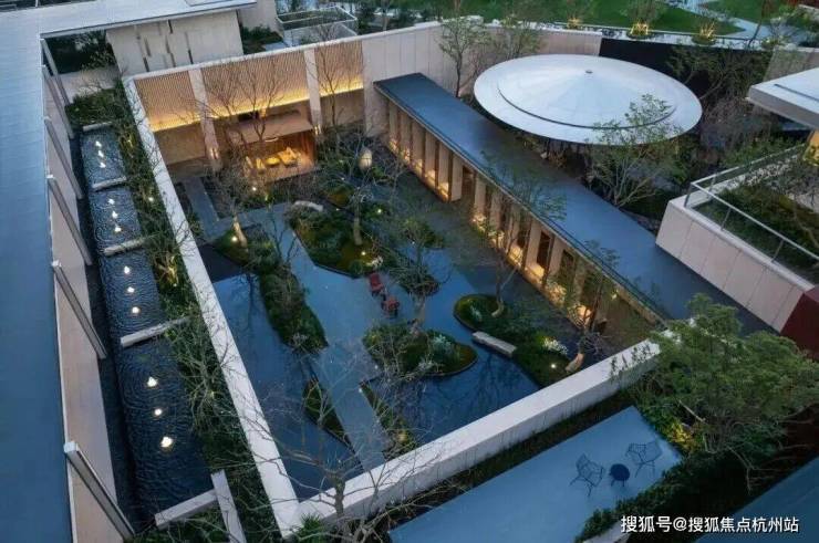 约6米高水幕的下沉式山水庭院,灵动的流水,层次丰富的空间,在自然松弛的氛围中,增添了一丝活泼的趣味。