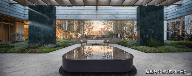 庭院中遍布着睡莲,从这里往出去像一幅画,高低层次的叠水景观,超大型的原石,还有私密的谈话空间,舒适惬意。