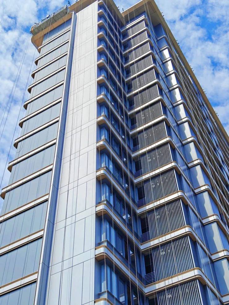 以极简线条勾勒建筑都市云盒造型和圆角建筑语言表达,结合三玻两腔双LOW-E的系统化外窗与精致的金、银、灰铝板细节,构建高级灰底色下的深浅冷暖材质对比,赋予建筑新时代美学。