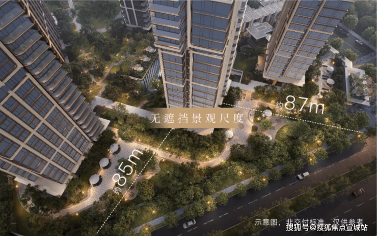 ②园景尺度非常夸张:作为沿江首排的中间楼栋,西边套更容易形成被社区园林包围的体验,面向江的一侧与侧向景观面,能出现超过80+米的无遮挡景观尺度.对改善客群来说,这种“森林客厅”的沉浸感很难得:不是站在高处远眺,而是把景观放大到日常生活里.