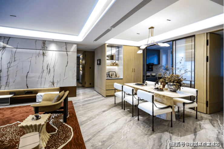 希腊灰密拼瓷砖、四边吊顶结合悬浮反光灯槽、岩板电视墙与浅米灰墙布相衬,共同营造出现代雅致的氛围,家庭聚会与商务接待皆可从容应对。