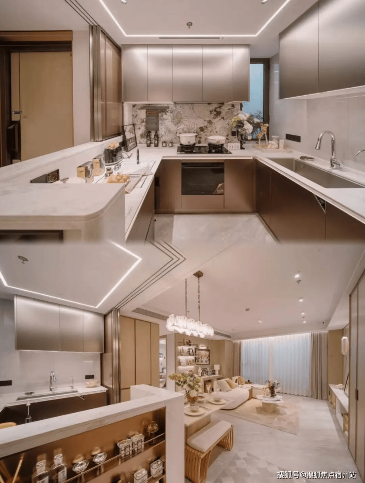 厨房:定制整体橱柜,方太 / 老板同款抽油烟机、燃气灶、洗碗机,摩恩 / 科勒同款水槽与龙头,配备嵌入式冰箱、微波炉预留位;