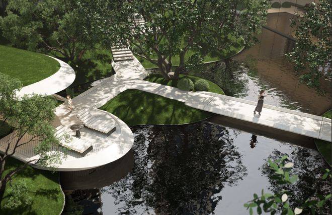 穿过园林,上海最大的约3500㎡下沉水院构成社区的核心灵魂,约13米的高差形成独特的“峡谷绿洲”,将黄浦江的水意象引入社区,中央平静水面与四周的会客舱、茶室、游泳馆形成呼应。