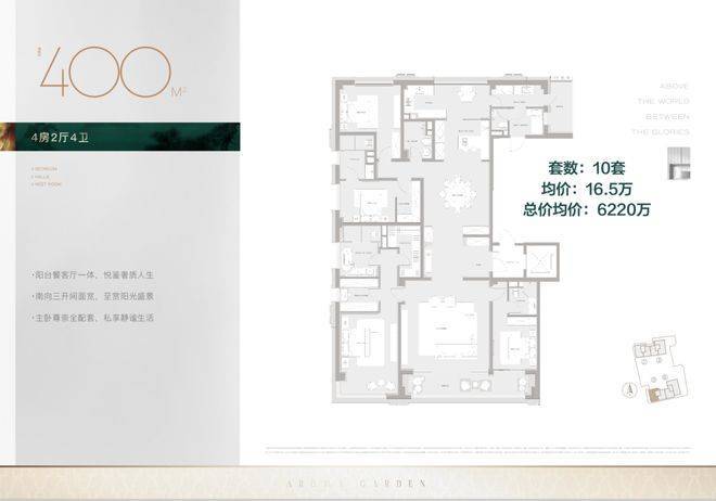 400㎡,4房4卫,单价16.5万,同理的西边套,户型几乎完全相同,不赘述了,单价提升的逻辑就是所在的楼栋南侧更开阔一些。