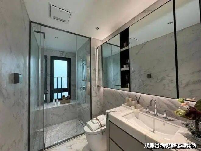 双卫配置,其中一个做了干湿分离,科勒台盆+双智能马桶+高仪花洒,除雾镜柜均内置了牙刷消毒器、预留吹风机插座。主卫镜柜还有美妆冰箱,收纳空间相当充足。