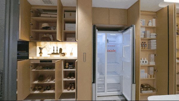 还有室内越级Pro的精睿收纳、超配臻装的品牌用材等空间革新,重塑家庭生活的精神尺度!特别是入户部分的玄关柜、墙柜、餐边柜等,都做了整排一体化,前期同样使用大受好评的S墙设计依旧得到延续,冰箱可以平整嵌入,大方美观。