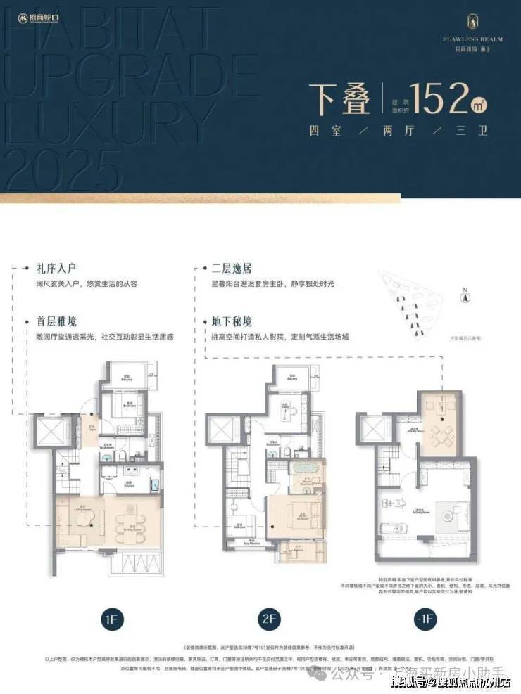 叠墅越级|约146-152㎡水岸墅居√下叠约152㎡海派水岸世家院邸餐客厅无界互动,串联家庭社交场主卧星幕阳台,晨光暮色皆成诗意背景挑高私属地下室,让个人的品味与个性在此尽情施展