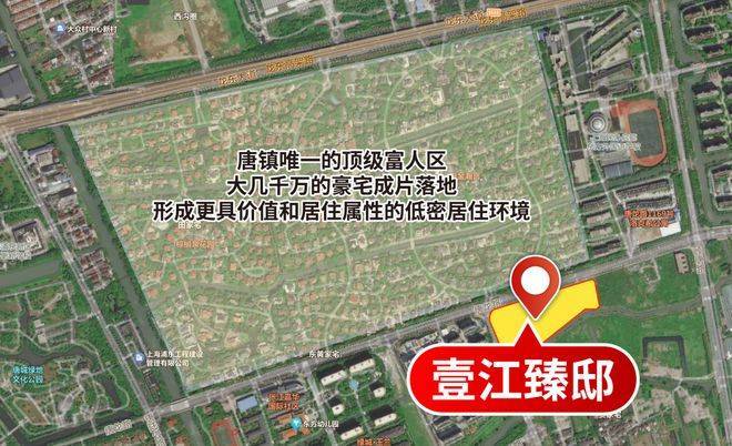 首先,它择址唐镇环境最好、圈层最高端的富人区,北面的三大顶级别墅区,起步总价就是约2500万+。