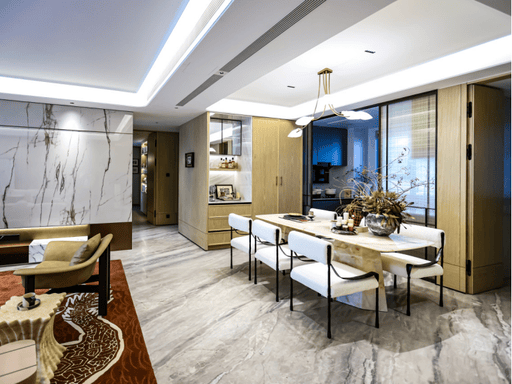 细节:全屋石材、岩板背景墙、弧形玻璃、隔音系统