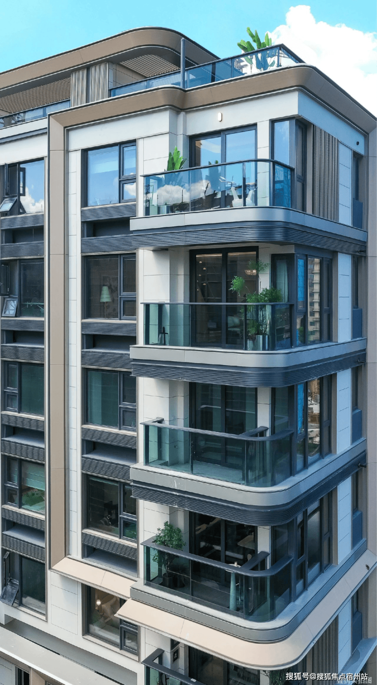 静奢曲线立面:转译武康大楼建筑符号,微弧阳台,首三层石材基座,金属线条 + 玻璃塔冠。