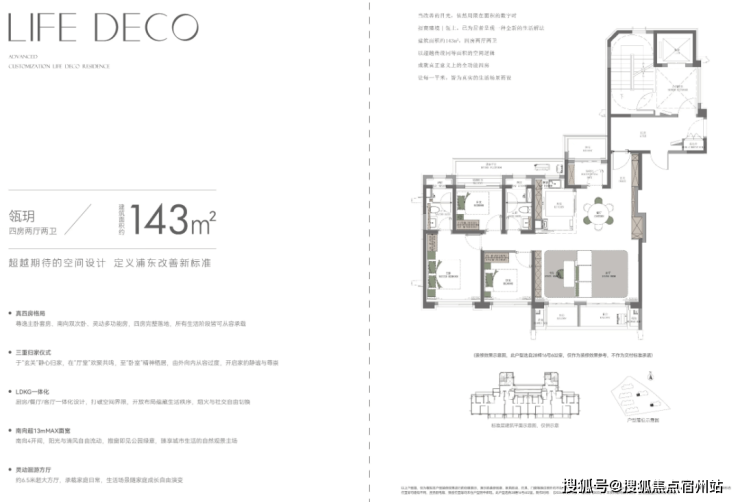 建面约 141㎡四房:三开间朝南、横厅 LDKB 一体化,三阳台 + 多飘窗,主卧套房带衣帽间,海派精工细节拉满。