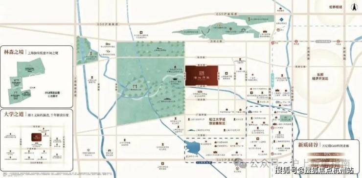 项目西侧一路之隔就是广富林文化遗址、广富林郊野公园、直线距离约1km+是辰山植物园,北面直线距离约3km是佘山国家森林公园、月湖雕塑公园等。