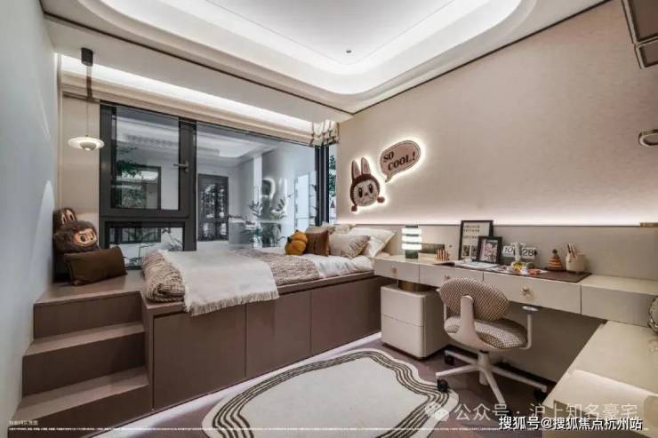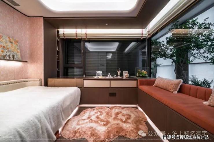 另外采用意大利 “大花白” 天然石材实现地墙满铺,双台盆与双镜柜的对称设计复刻五星酒店规制,美妆冰箱精准控温呵护护肤品,奢华至极!