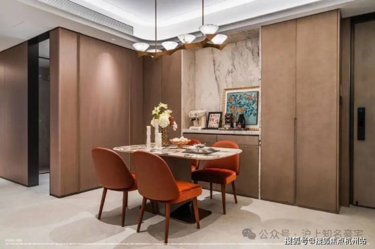 卧室则铺设海派鱼骨拼花地板,借木质肌理的温润与细腻,营造出私密领域的宁静氛围!这种“公区显质感、私域藏温度”的材质分区逻辑,恰是高端住宅设计中至关重要的一笔!