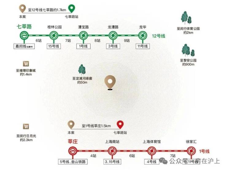 商业方面,离项目最近的商业是12号线七莘路站地铁上盖综合体维璟印象城,直线距离仅相距约1.4公里