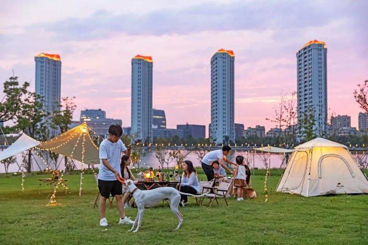周末的兰香湖,人们携家带口来野餐、露营,亲近大自然,湖边草坪上架起一顶顶帐篷.运动爱好者,可以在近4公里的湖岸边自由骑行或相约夜跑.简直是遛娃遛狗的圣地,孩子们疯玩一天不厌倦,如同度假一般享受.