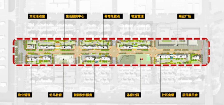 一轴:幼儿园、体育公园、快递驿站、文化活动空间等