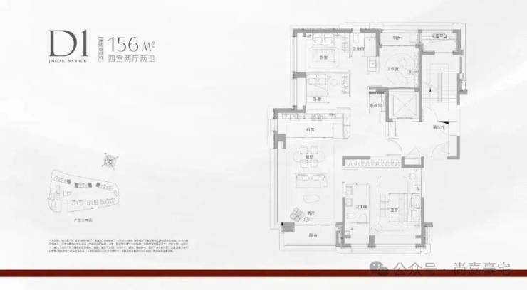 建面约156㎡四房两厅两卫:LDKG一体化餐客厅,直面园区景观;多飘窗设计,户户观景;南向豪华主卧配备超大一字衣帽间与朝南双台盆卫浴,尊崇感十足。各居室尺度宽裕,匹配高阶改善家庭的生活品味。