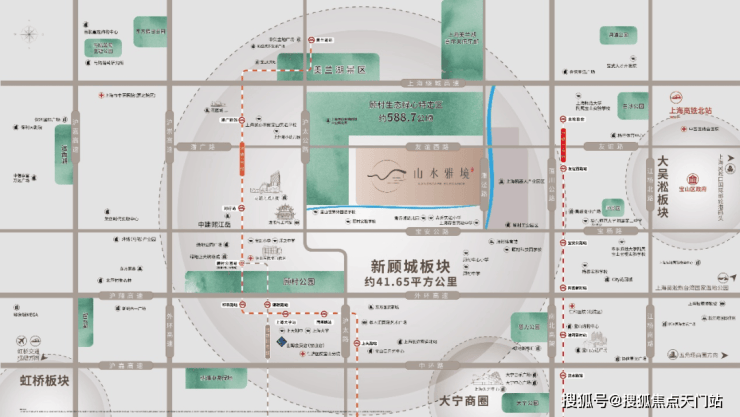 在宝山主城发展链上,新顾城位于沪太路城镇发展轴和宝杨路-宝安公路功能发展轴的轴心,东西向链接嘉定远香湖中央活动区、吴淞创新城,南北向联动南大智慧城,成为北上海产业升级转型的产城高地。