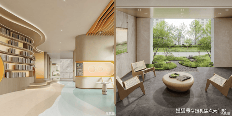 结合建景观筑、空间、自然环境关系,室内室外联动,呈现一个会客、海浪书屋、儿童休闲等多重功能的开放式架空层,为全龄社交营造一个“有温度、有态度”的邻里空间。