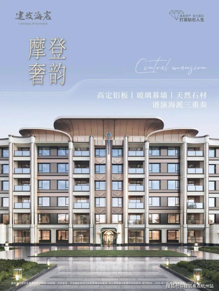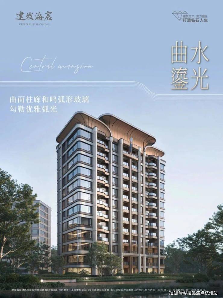 建发「宸系」中式作品,铝板与玻璃幕墙外立面,配园林景观。约1150套房源高低配,限高40米,含小高层、洋房、叠墅产品,满足刚需与改善需求。