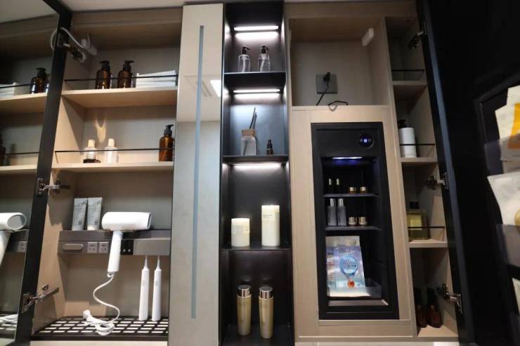 主卫马桶为高仪智能马桶,次卫马桶为科勒。洗手台采用大面积岩板匠心打造,搭配精奢石台面,彰显细致入微的质感。整面墙的镜柜,内部配备了美妆冰箱+门板收纳架+轨道式置物架,储物空间打造的非常充足。