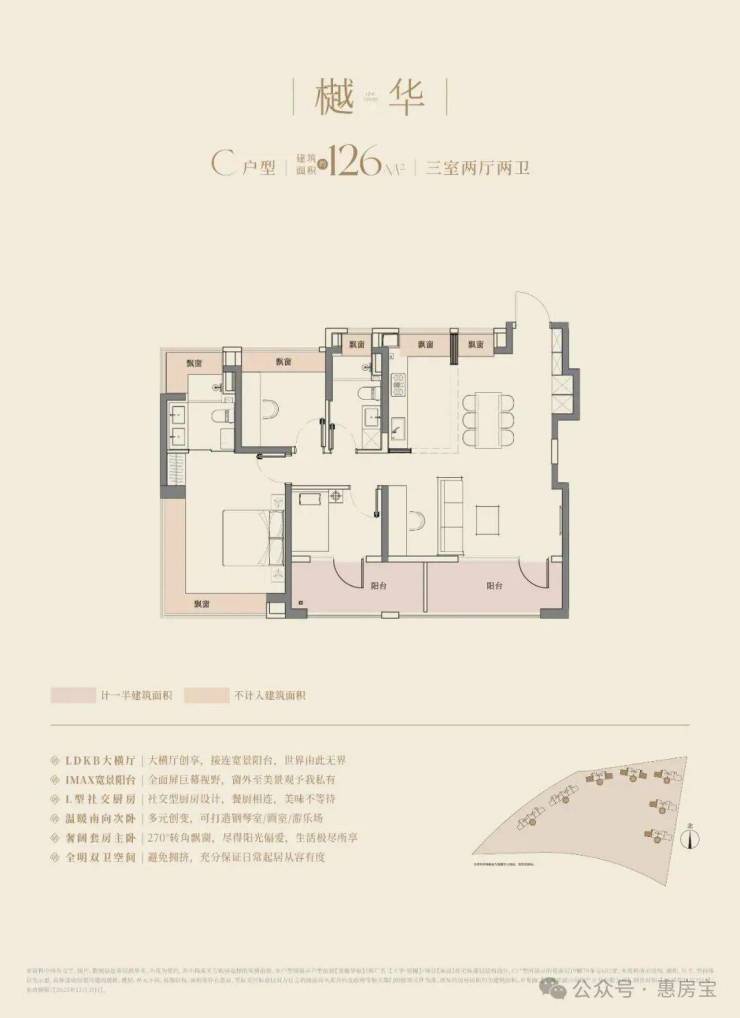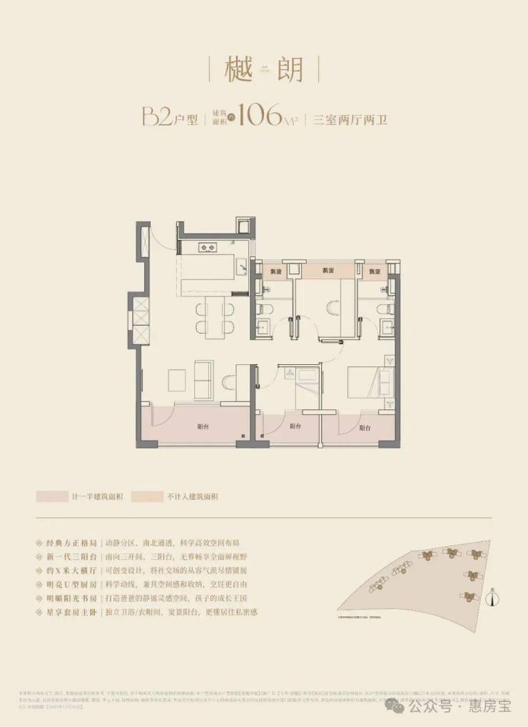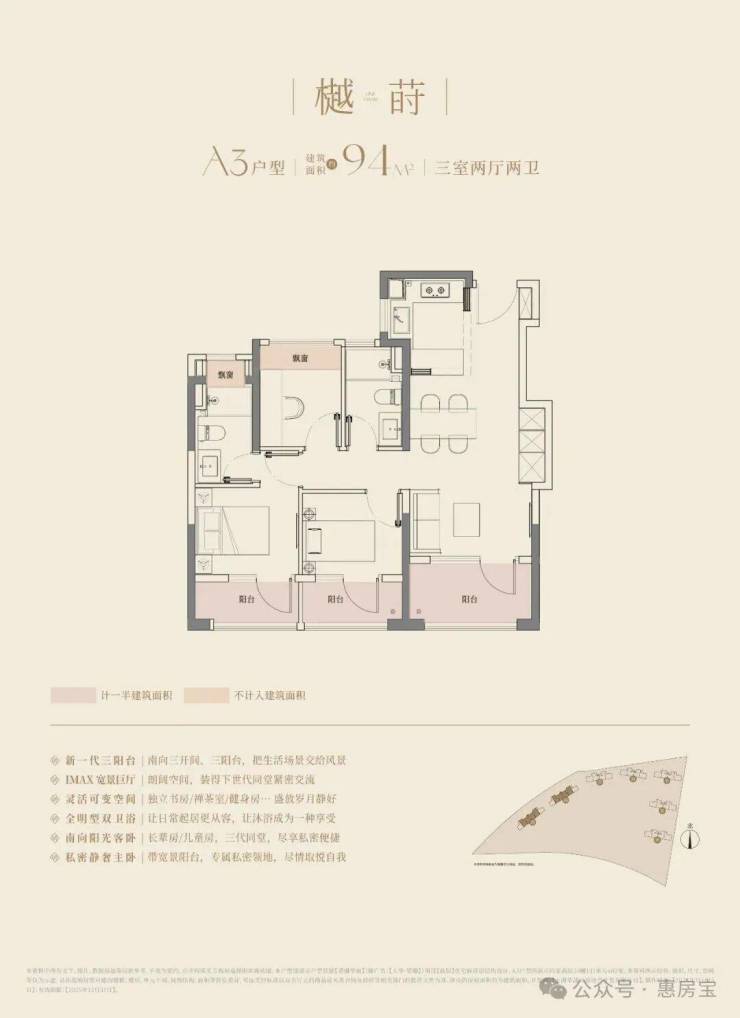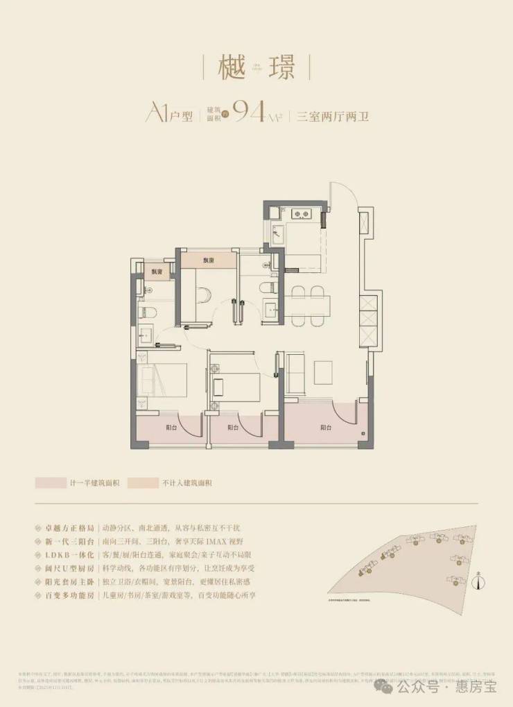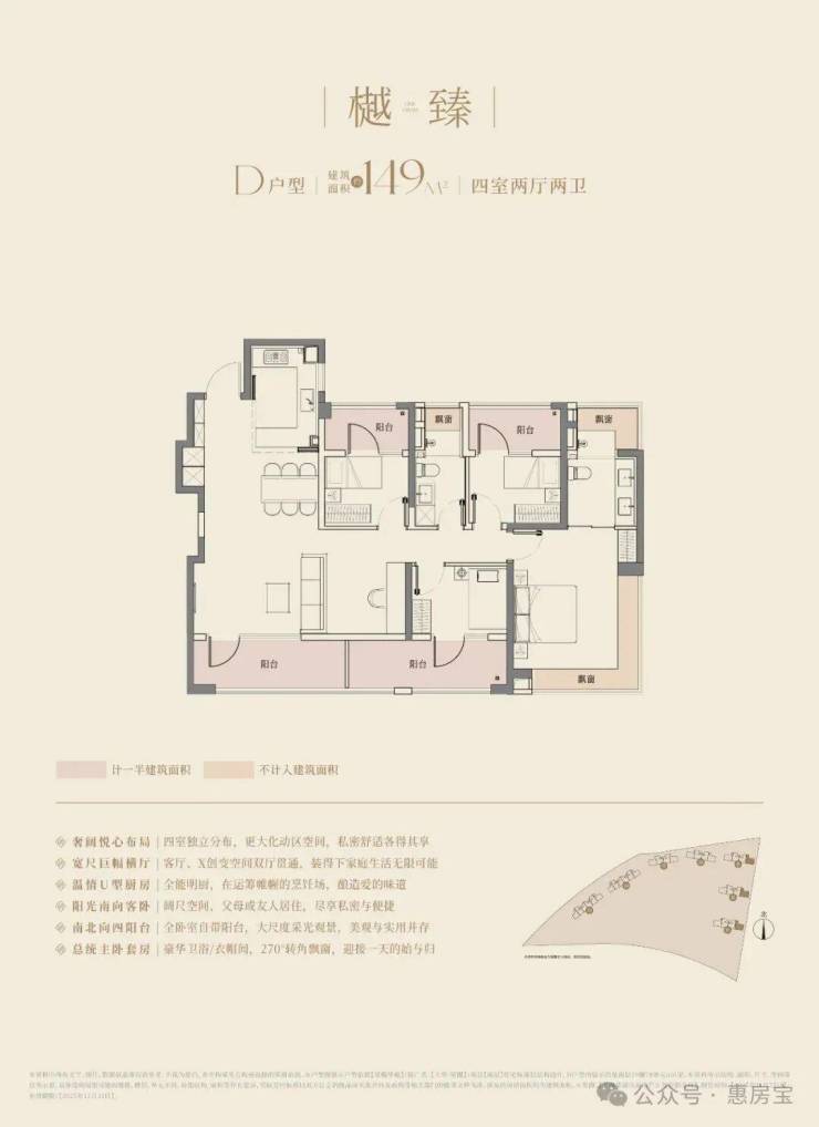 经典动静分离户型,预留分户“S”墙设计,三开间朝南+双阳台,阳台合仅计算一半建筑面积,主卧以及主卫附赠270°转角飘窗;