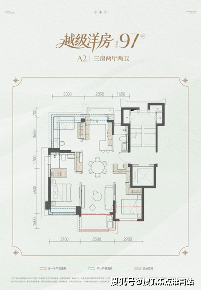 约97㎡「越级洋房」三室两厅两卫,以约86-90%的高实得率,采用零走道飞机户型设计,相当于常规市面产品的109m2产品,实现全明正三房的舒适体验。