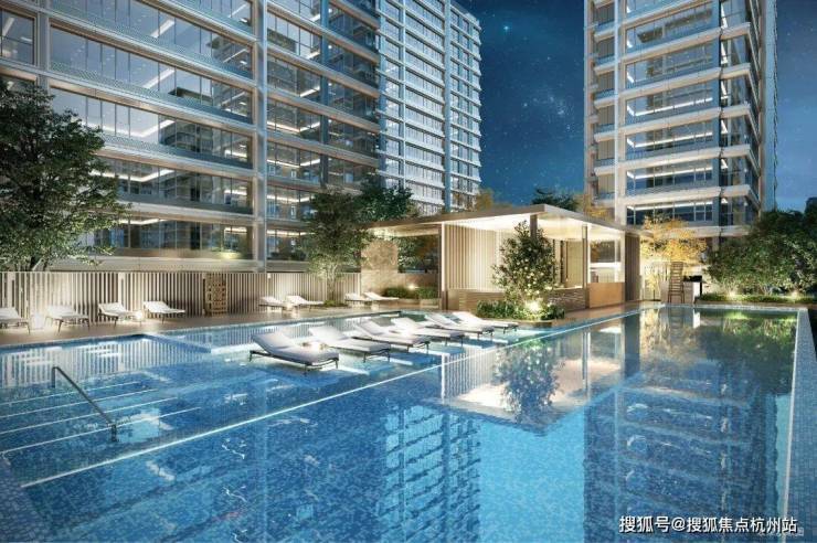 社区规划格局采用中轴对称,内部有室外游泳池、景观廊道和中心大花园,部分楼栋设置架空层,建筑里面以非对称形式的设计手法,打造现代化理念。