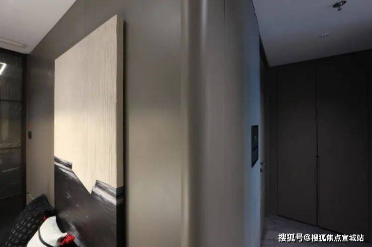 主卧入户隐形门设计/客厅一体式背景墙/橱柜收口弧形木饰面处理;