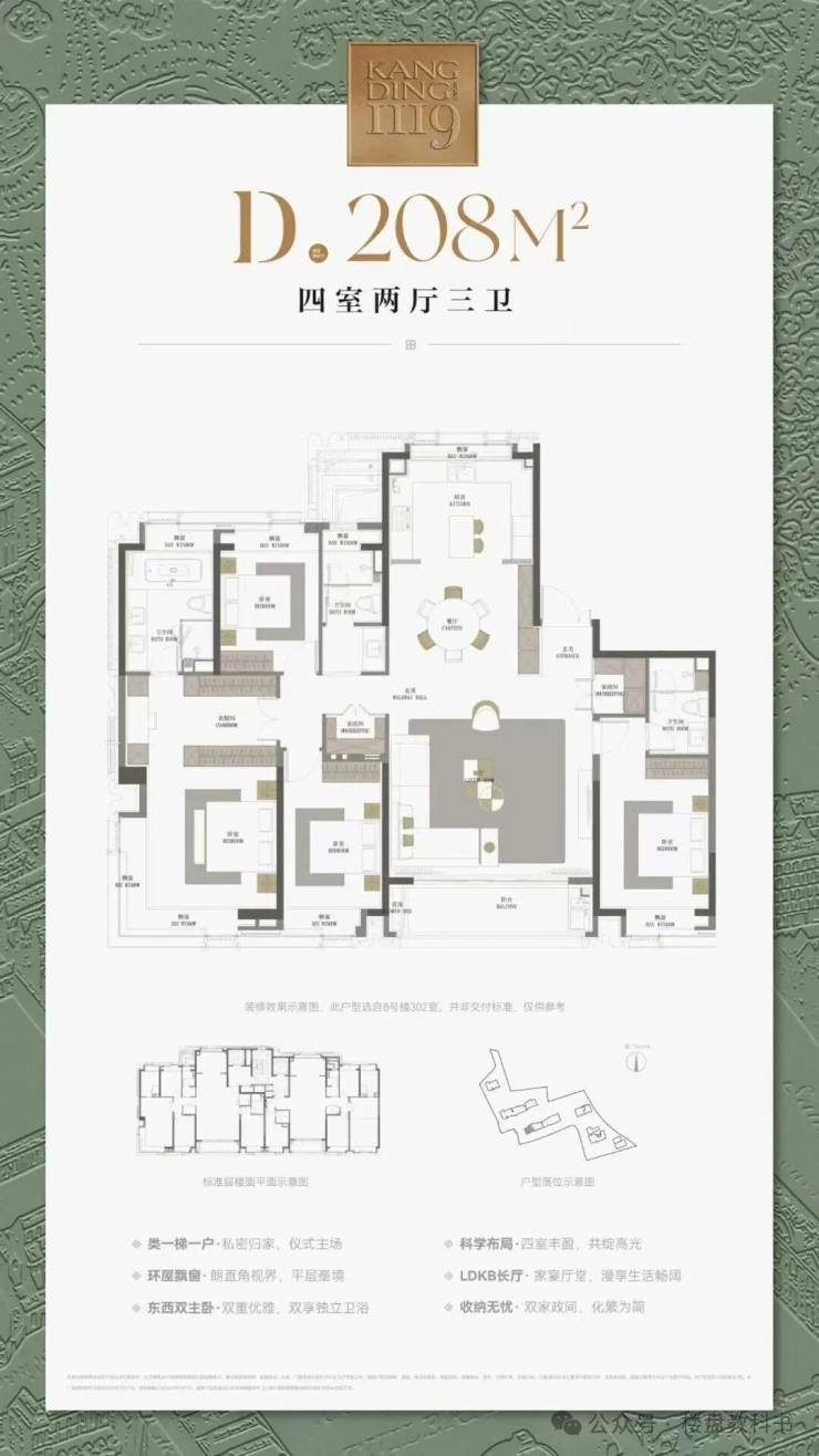 建面约208㎡4房:四开间朝南的边套宽奢4房,约270°的巨幕采光面,让这个户型的每一个空间都充满阳光,终极改善的首选户型。