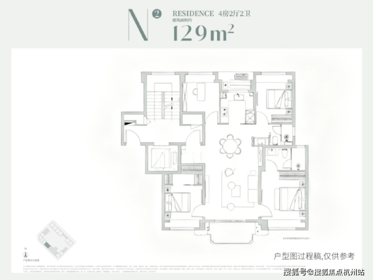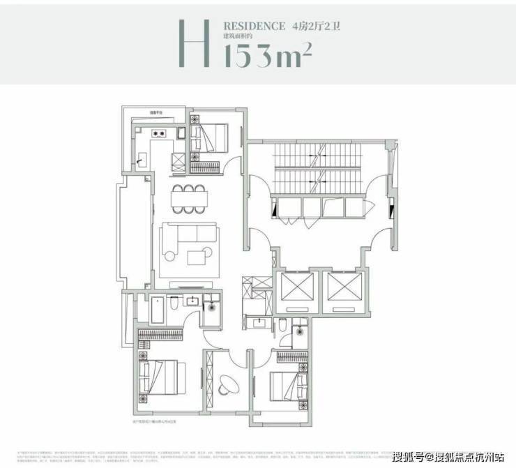 经典的四叶草布局,四开间分布在四角,兼顾私密与互动,是二胎家庭的优选。