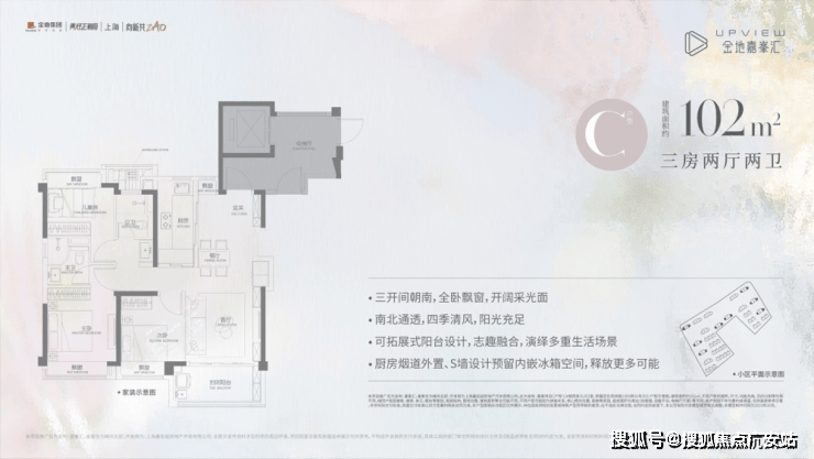 以及我们的网红爆款,建面约102㎡(C户型)三房两厅两卫,不仅保留了其小户型所有的优势,更增强了空间感和舒适度!
