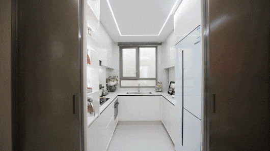 LDKB一体化设计 ,约5.4米超大面宽客厅搭配同尺度阳台,公区的贯通性被加强,从北到南,厨房、餐厅、客厅、阳台全部打通。