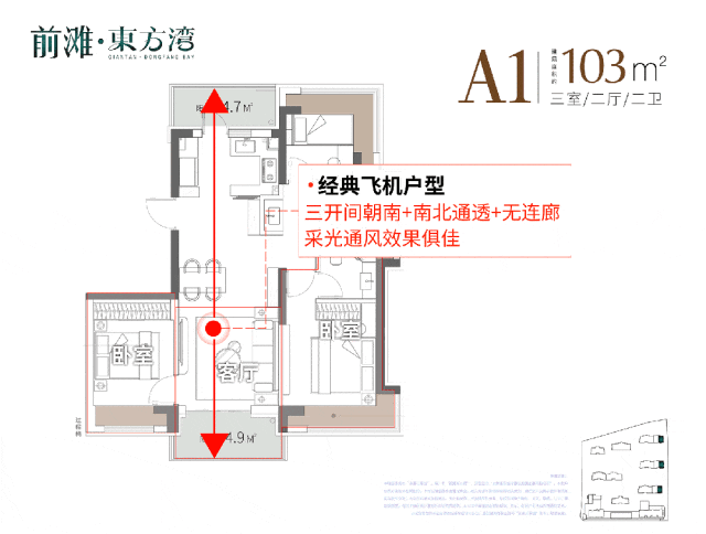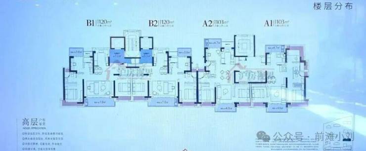 户型建筑层高3.1-3.15米,无连廊,双阳台配置。其中建面约103平户型2梯2户,其余一梯一户。