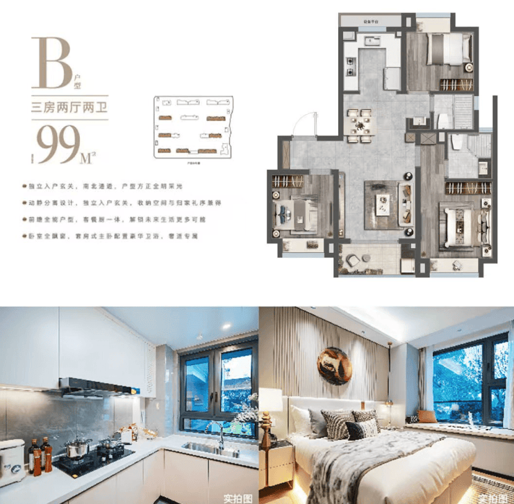 88-99㎡主力三房户型,适配刚需到改善的全家庭需求,餐客一体设计搭配南向大窗墙比,让空间更显通透阔绰。更难得的是,精装交付标配三菱重工中央空调、新风系统、博世地暖 “三大件”,辅以科勒、方太等国际品牌厨卫,30 余项细节设计尽显匠心,真正实现 “刚需价格,改善品质” 的越级体验。
