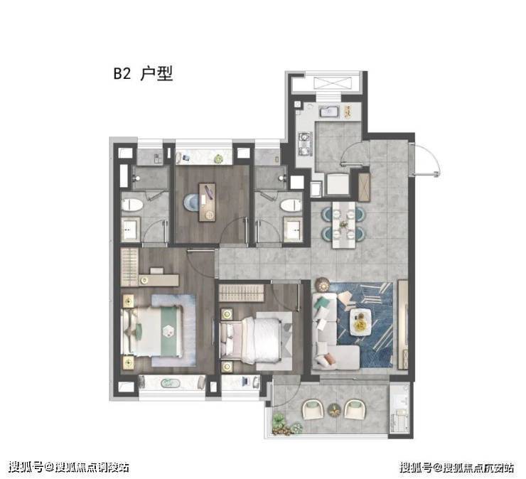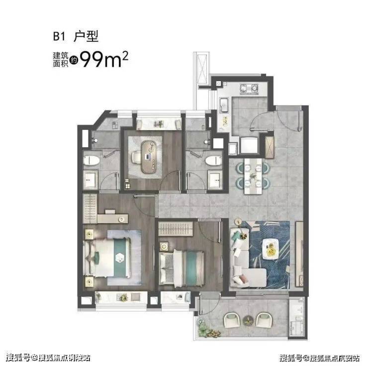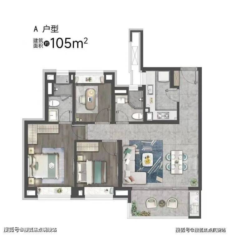 建面约105㎡为5.1米宽厅设计外接大阳台,这对黄金组合一方面撑开户内尺度,另一方面也让通风和采光俱佳。