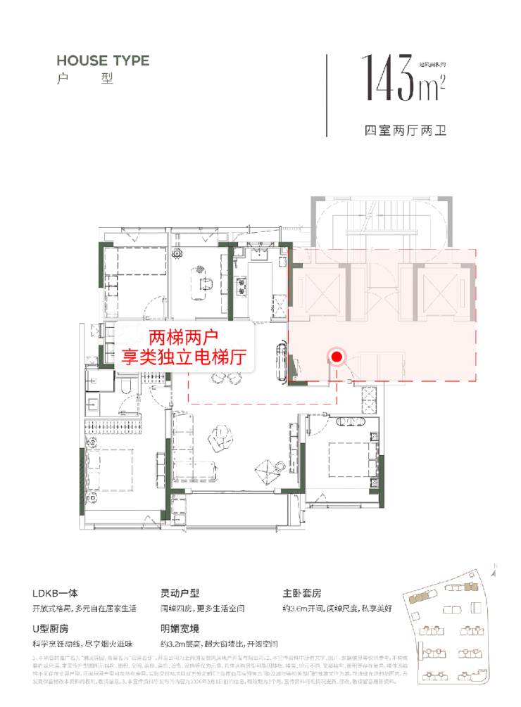 约 143㎡四房:两梯两户,类独立电梯厅,层高约 3.2 米,客餐厅通透,适配多代同堂