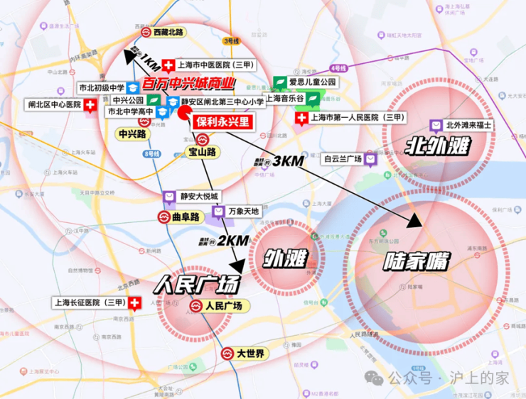 区域配置上,直线距离3公里内涵盖南京西路、人民广场、外滩、外白渡桥等顶级商圈与地标,尽享城市繁华。周边交通便捷,距8号线中兴路站约450米,3/4号线宝山路站约400米,三轨环绕,通勤极为便利。1公里内汇聚华润苏河湾中心、中粮大悦中心、万象天地等高端商业,同时坐拥约17.5万㎡城市公园绿地(规划中)、苏河湾公园体系、中兴公园等生态资源,居住环境舒适宜居。医疗资源丰富,3公里内有上海市中医医院、上海长征医院、上海市第一人民医院、上海第十人民医院等多家三甲医院,全方位满足生活需求。
