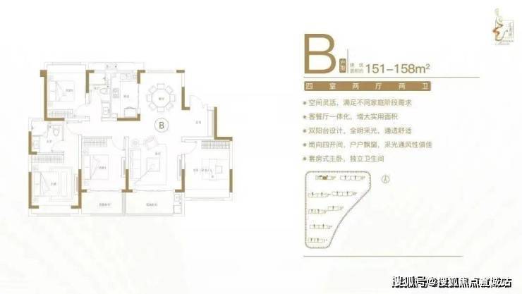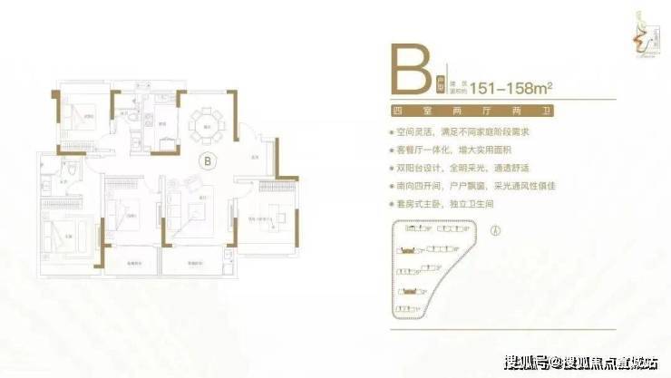 建面约151-158㎡四室两厅两卫户型特点:空间灵活,满足不同家庭阶段需求;客餐厅一体化,增大实用面积;双阳台设计,全明采光,通透舒适;南向四开间,户户飘窗,采光通风性俱佳;套房式主卧,独立卫生间。