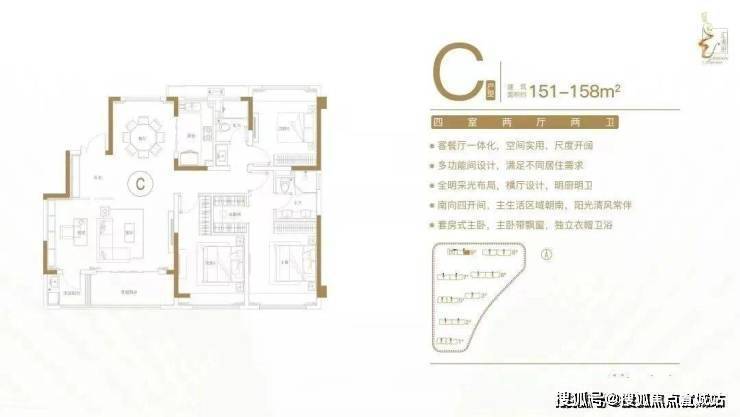 建面约151-158㎡四室两厅两卫户型特点:客餐厅一体化,空间实用,尺度开阔;多功能间设计,满足不同居住需求;全明采光布局,横厅设计,明厨明卫;南向四开间,主生活区域朝南,阳光清风常伴;套房式主卧,主卧带飘窗,独立衣帽卫。
