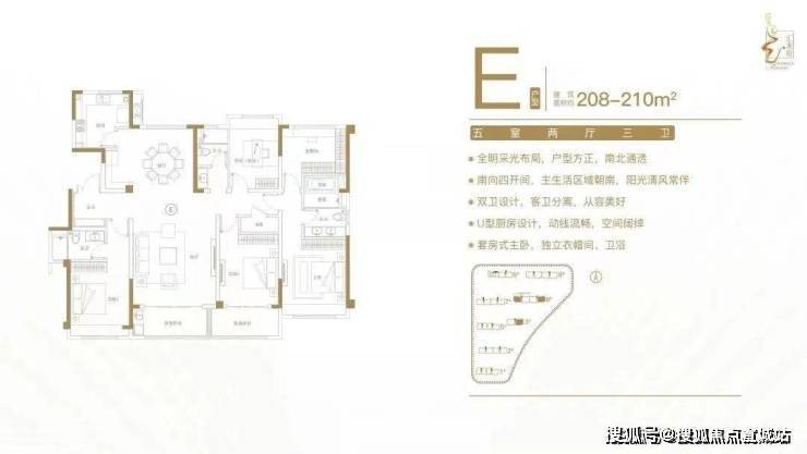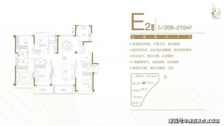 建面约208-210㎡五室两厅三卫户型特点:全明采光布局,户型方正,南北通透;南向四开间,主生活区域朝南,阳光清风常伴;双卫设计,客卫分离,从容美好;U型厨房设计,动线流畅,空间阔绰;套房式主卧,独立衣帽间、卫浴。