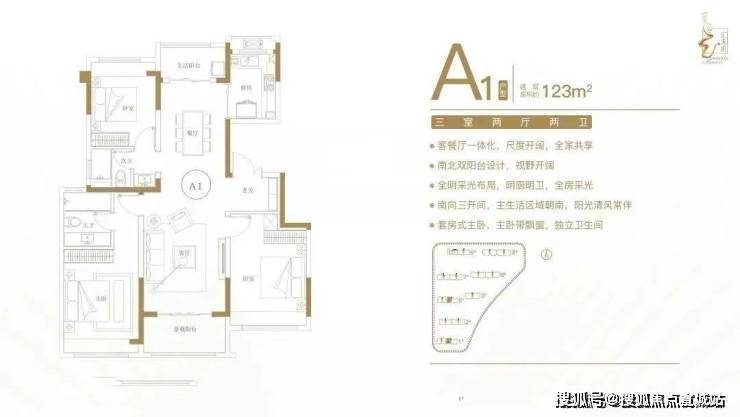 建面约123㎡三室两厅两卫户型特点:客餐厅一体化,尺度开阔,全家共享;南北双阳台设计,视野开阔;全明采光布局,明厨明卫,全房采光;南向三开间,主生活区域朝南,阳光清风常伴;套房式主卧,主卧带飘窗,独立卫生间。