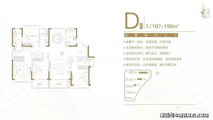 建面约187-196㎡四室两厅三卫户型特点:户型方正,南北通透,动静分区有序;双套房设计,卧室带飘窗,独立卫生间;客餐厅一体化,尺度开阔,全家共享;全明采光布局,告别暗房,明厨明卫;南向四开间,阳光清风常伴。
