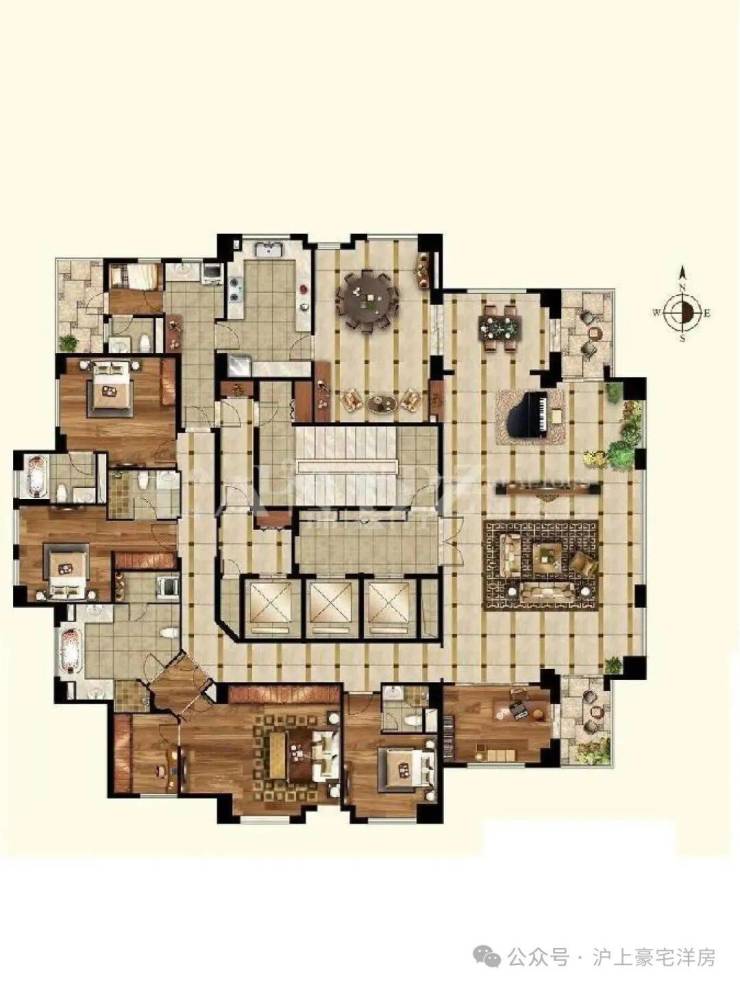 333㎡4 房 2 厅 3 卫:超大面宽客厅,中西双厨设计,主卧带独立衣帽间、卫生间、观景阳台,奢华感、私密性拉满。