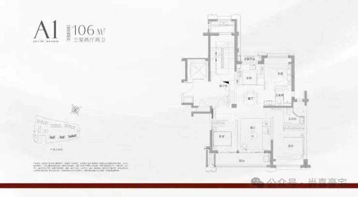 建面约106㎡三房两厅两卫(其他):三面采光设计,客厅配备270°采光窗,搭配多飘窗/阳台,室内通透明亮,观景视野佳;南北双阳台布局,兼顾生活与休闲需求,过道预留储物空间,收纳能力升级;主卧套间设计保障私密,各居室尺度均衡,无明显空间浪费,适配刚需及首改家庭。