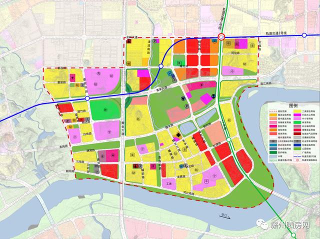 规划以绿化廊道和滨江绿带连通东西两带绿化和南北山、水景观,沿客家大道布置体育、教育、医疗卫生、商业和商务中心,沿赣丰线布置行政办公、商务用地,沿章江北岸主要安排居住用地。规划总用地面积647.74公顷。