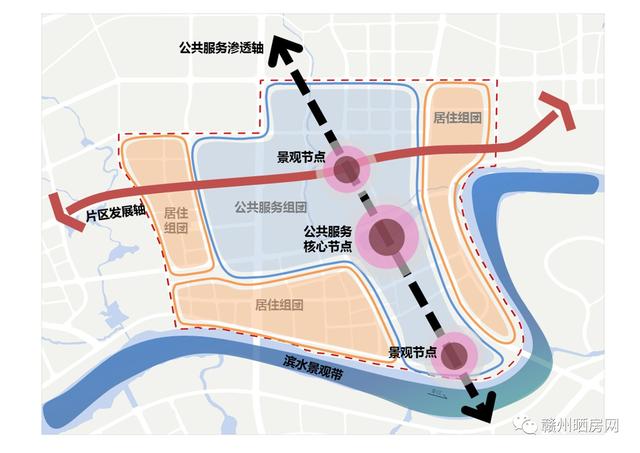 规划将该区域建设成为聚集赣州经济技术开发区经济与社会发展核心要素的“经开区核心区”,形成一带、两轴、三点、四片的规划结构。
