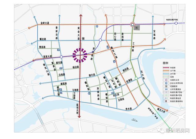规划形成“三纵两横”的主干路网结构。三纵为黄金大道、章贡王路、工业路;两横为金岭大道和客家大道。