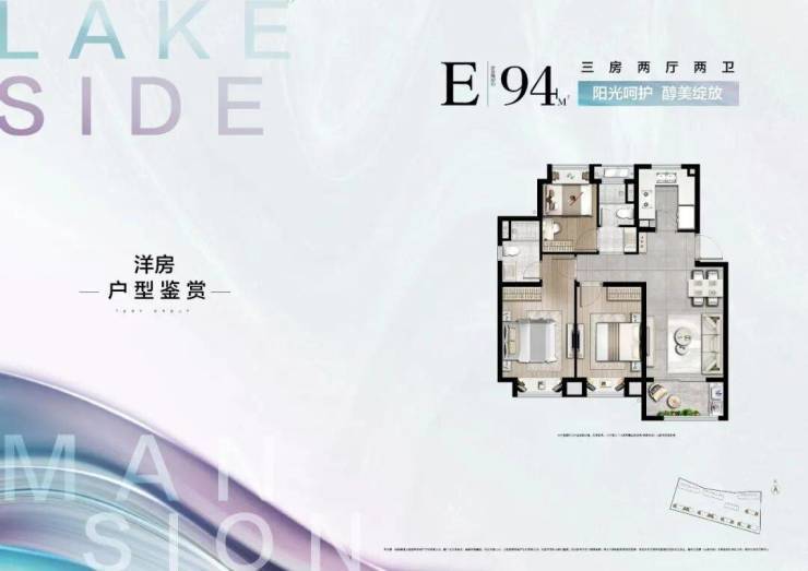 约94㎡是“全功能三房两卫”户型,厨房-客厅-阳台一线联通,南北通透。